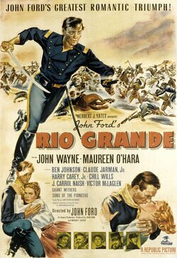 Rio Grande décrit dans le détail la vie dans un campement de la cavalerie américaine, ainsi que celle d'un père qui découvre la paternité et redécouvre cet amour qu'il a quitté il y a 15 ans, avec distanciation. Pendant ce temps les femmes s'évanouissent et font lessive et repassage.